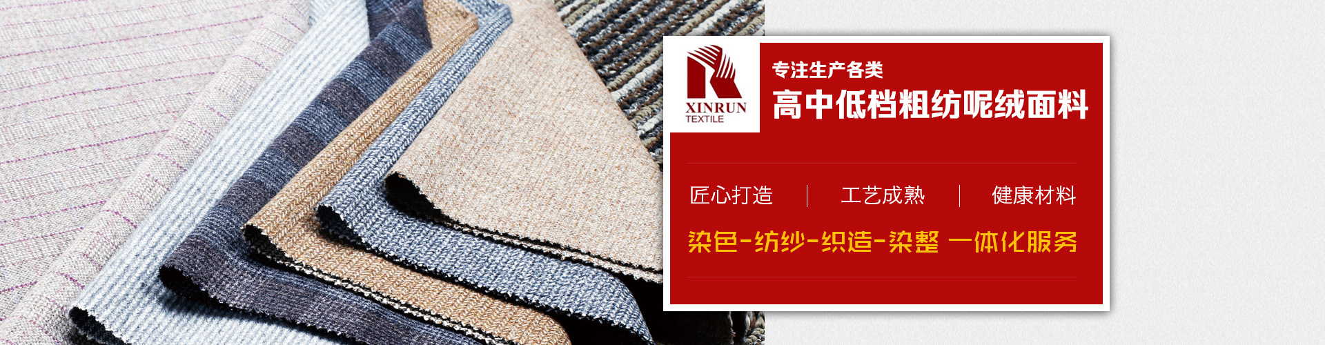主要產(chǎn)品有:法蘭絨、麥爾登,立絨,順毛,兔羊絨,阿爾帕卡,雙面呢,格呢,斜紋呢、圈圈呢、針織毛呢,臺球呢和地毯等幾百個(gè)品種以及上千個(gè)花色,另外新開發(fā)特種花式紗面料、復(fù)合,印花,扎染,涂層,貼膜,防水,防靜電等各類功能型面料。